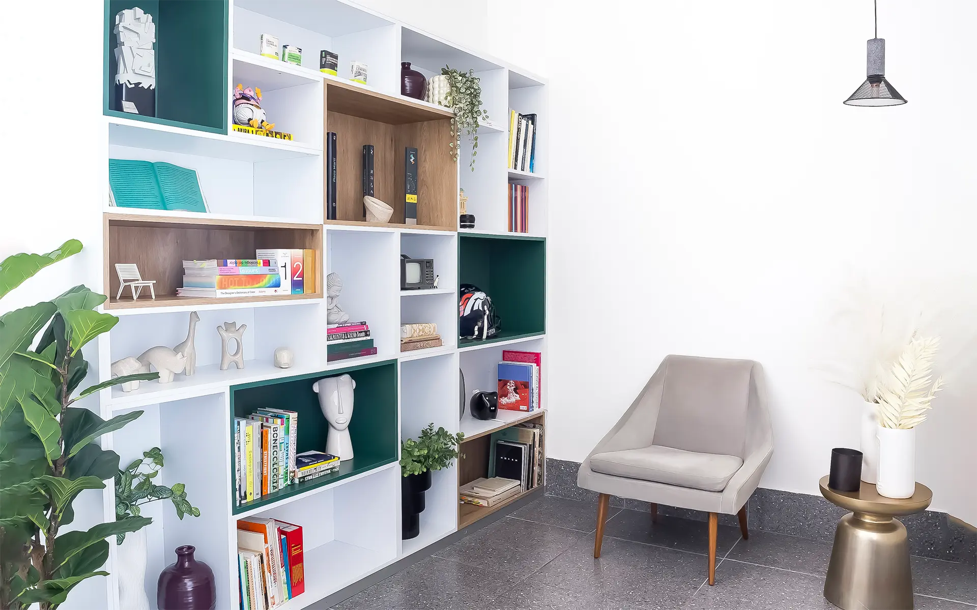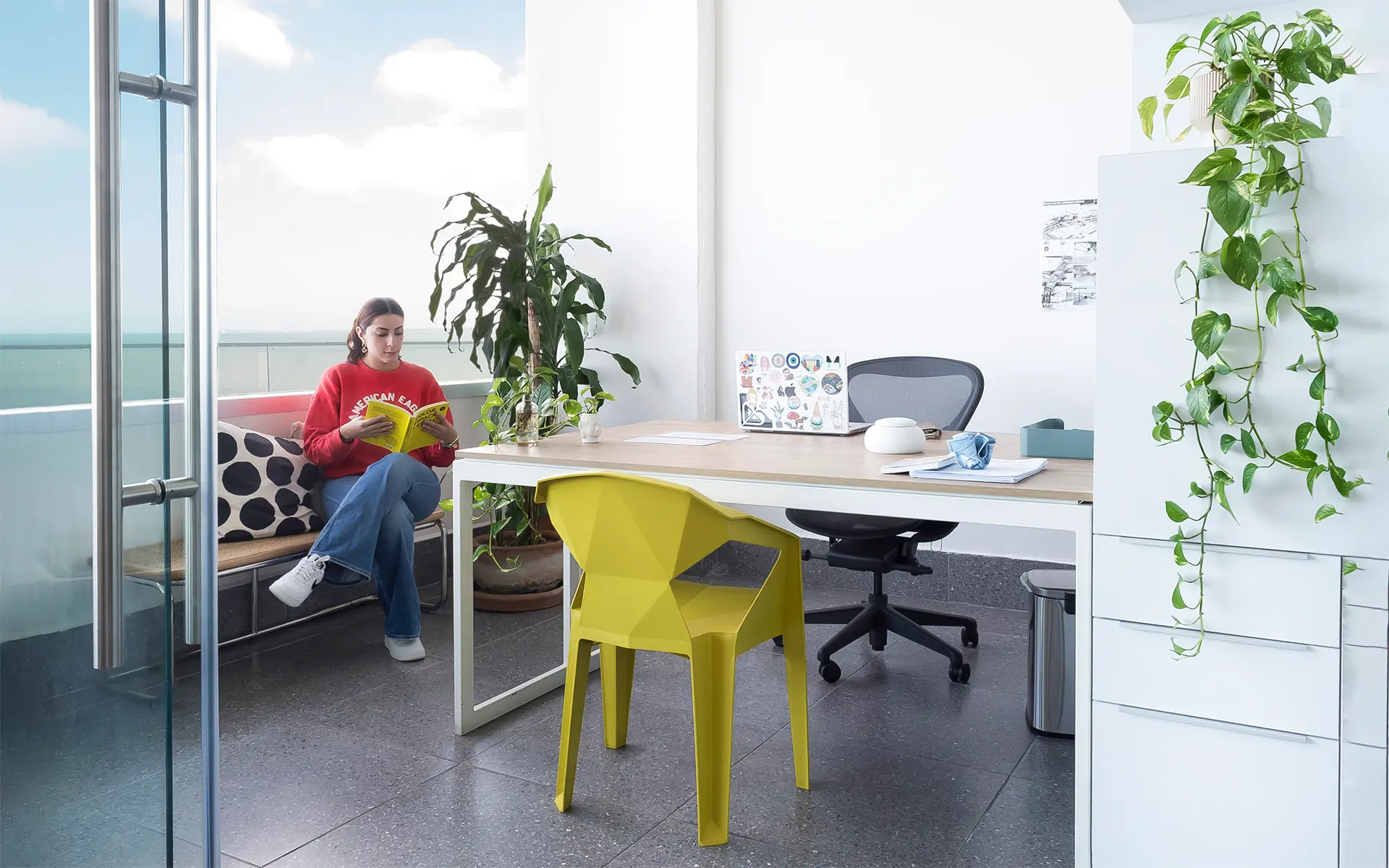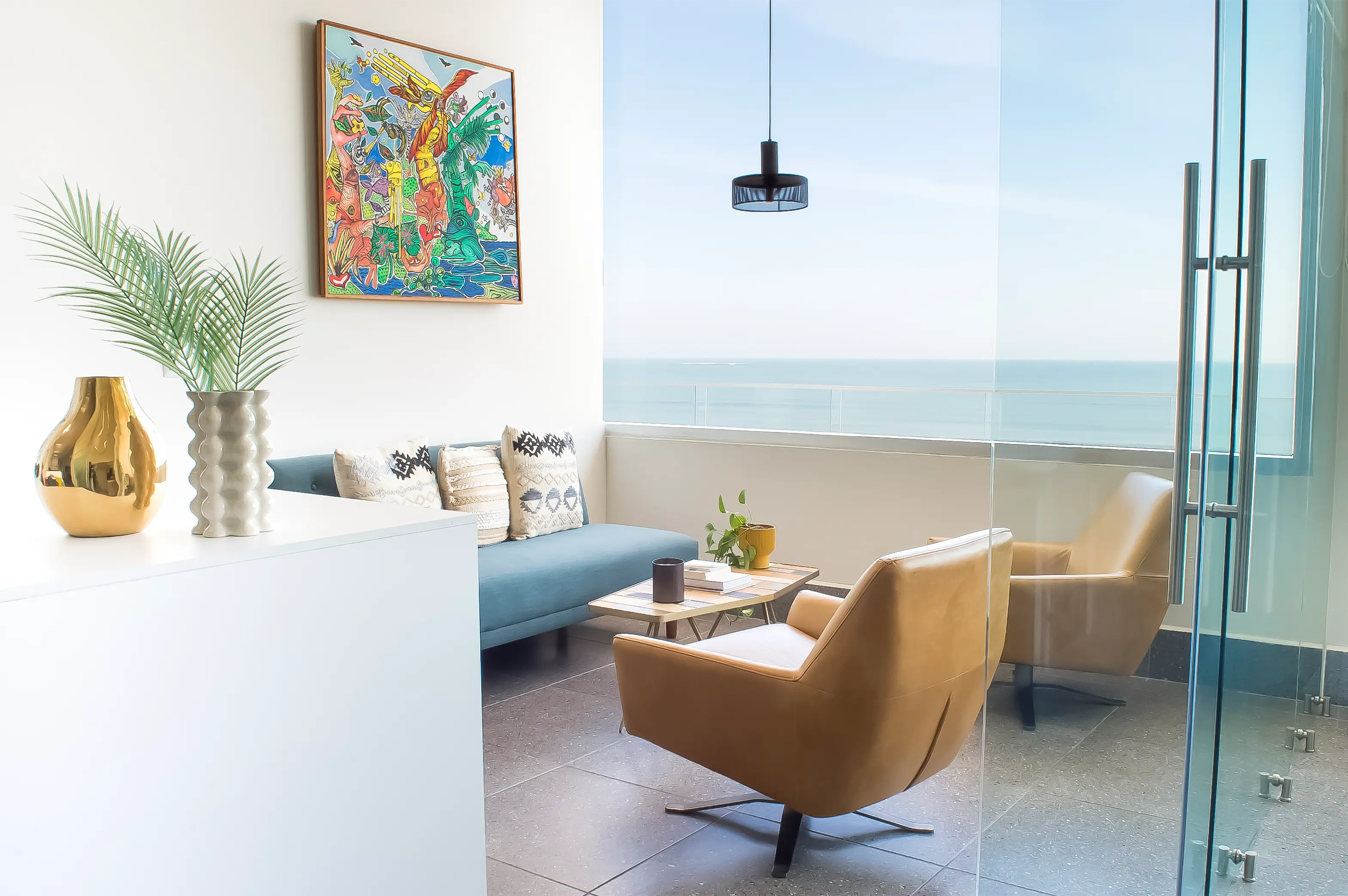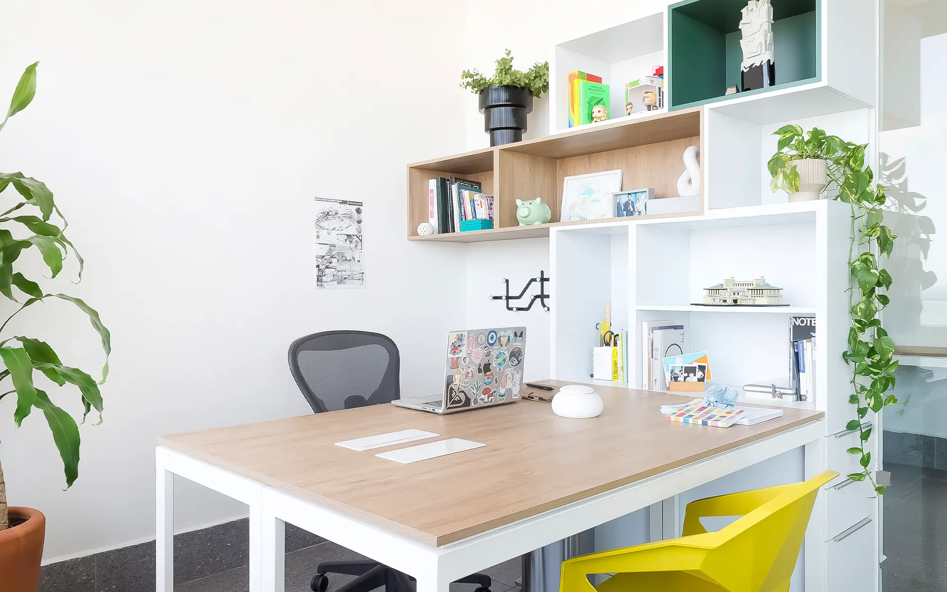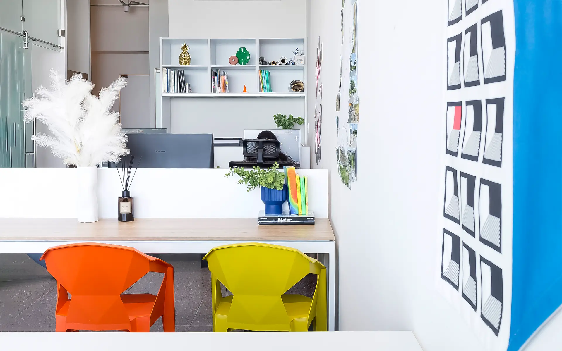 El mobiliario de diseño y las piezas hechas a medida se combinan con objetos y elementos propios del despacho, incorporados como parte de la narrativa visual. Obras de arte, toques de color y texturas cálidas se entrelazan para crear una atmósfera contemporánea y versátil. Cada mueble, cada luminaria y cada detalle está pensado para ser tan funcional como inspirador, reforzando la idea de que el entorno puede potenciar la creatividad.