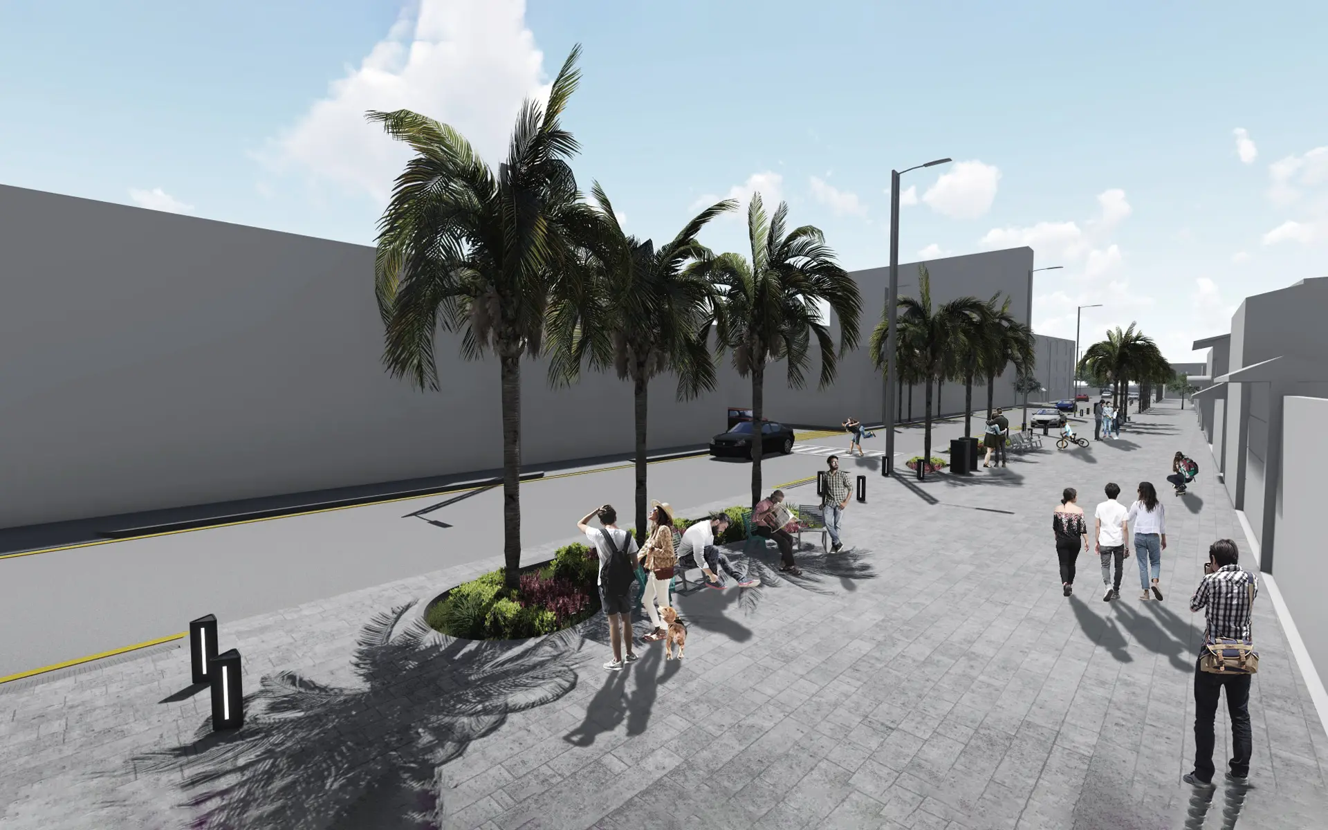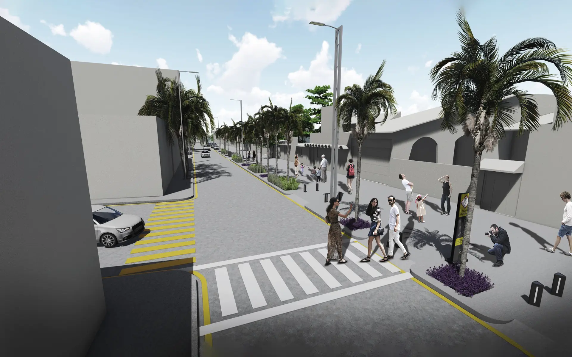 La intervención reinterpreta los códigos visuales y materiales del distrito, incorporando colores que invitan a la permanencia y fomentan la interacción. El pavimento conecta de forma fluida los puntos clave del corredor, integrando zonas de descanso y vegetación que enriquecen la experiencia urbana. Más que una mejora estética, la propuesta busca fortalecer la identidad local a través de un diseño coherente y vivencial.