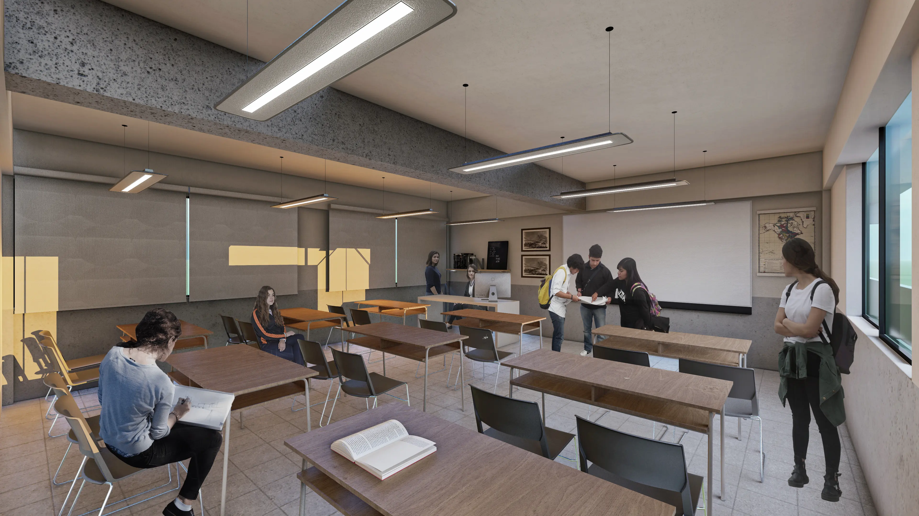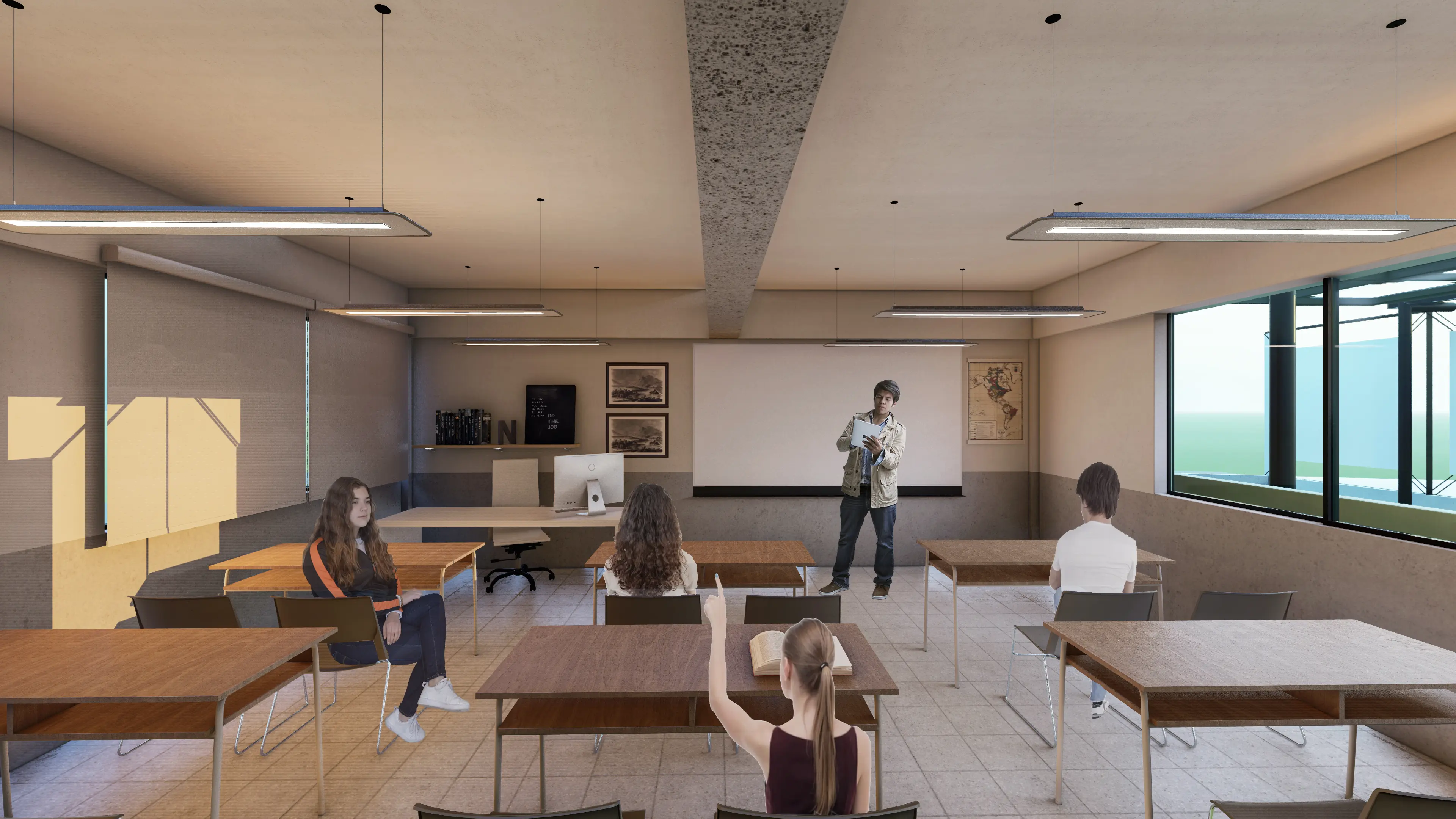 El diseño articula aulas multidisciplinares, áreas comunes abiertas y puntos estratégicos para la interacción, fomentando la conexión entre estudiantes y docentes. Se priorizó la integración de luz natural, recorridos fluidos y materiales atemporales que transmiten frescura y calidez. La propuesta combina funcionalidad y estética en un lenguaje arquitectónico que apuesta por la flexibilidad, haciendo que cada espacio pueda adaptarse a las necesidades cambiantes de la enseñanza contemporánea.