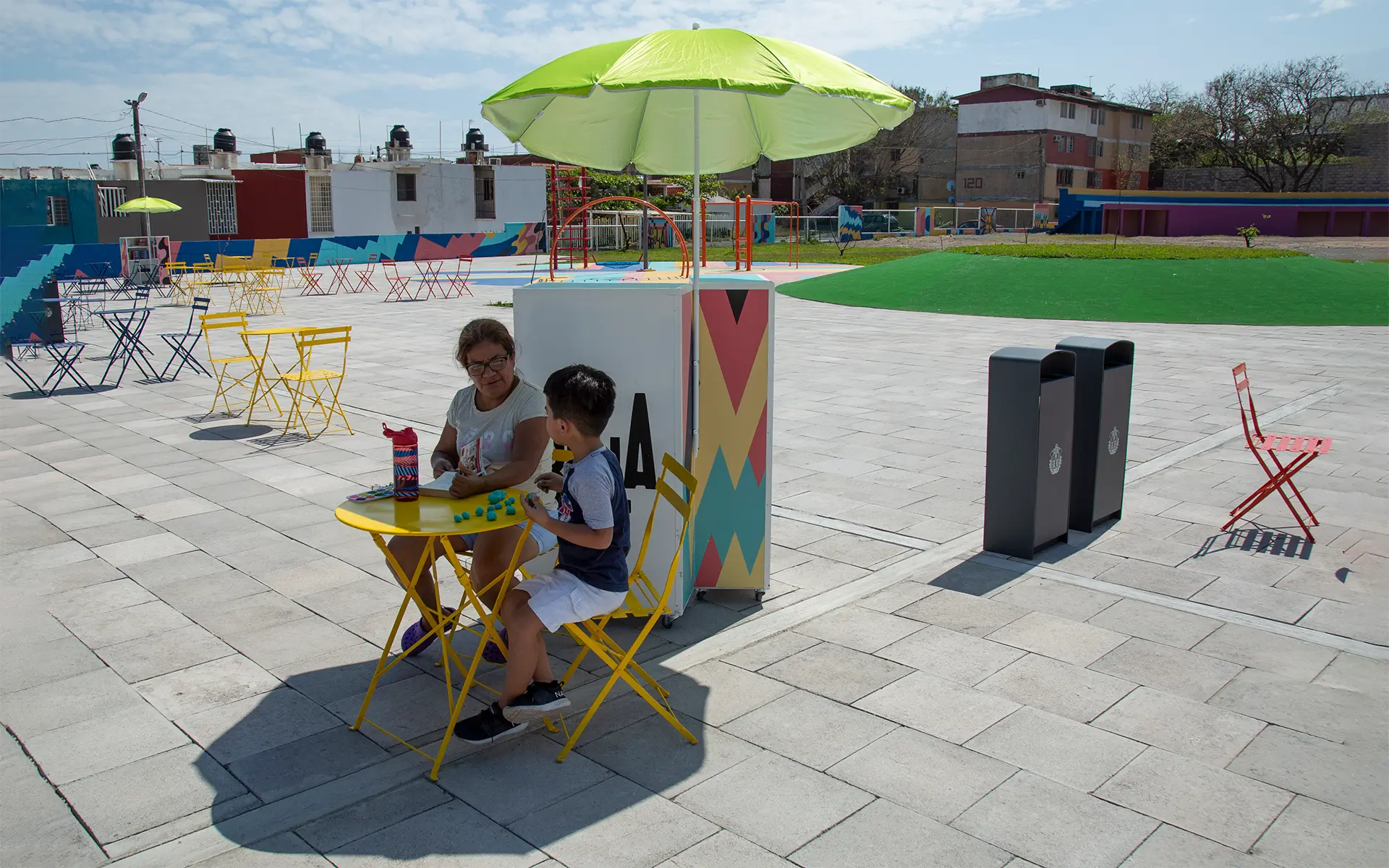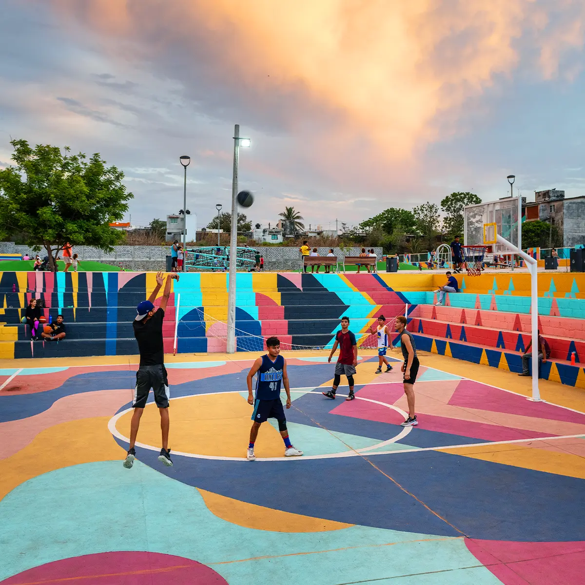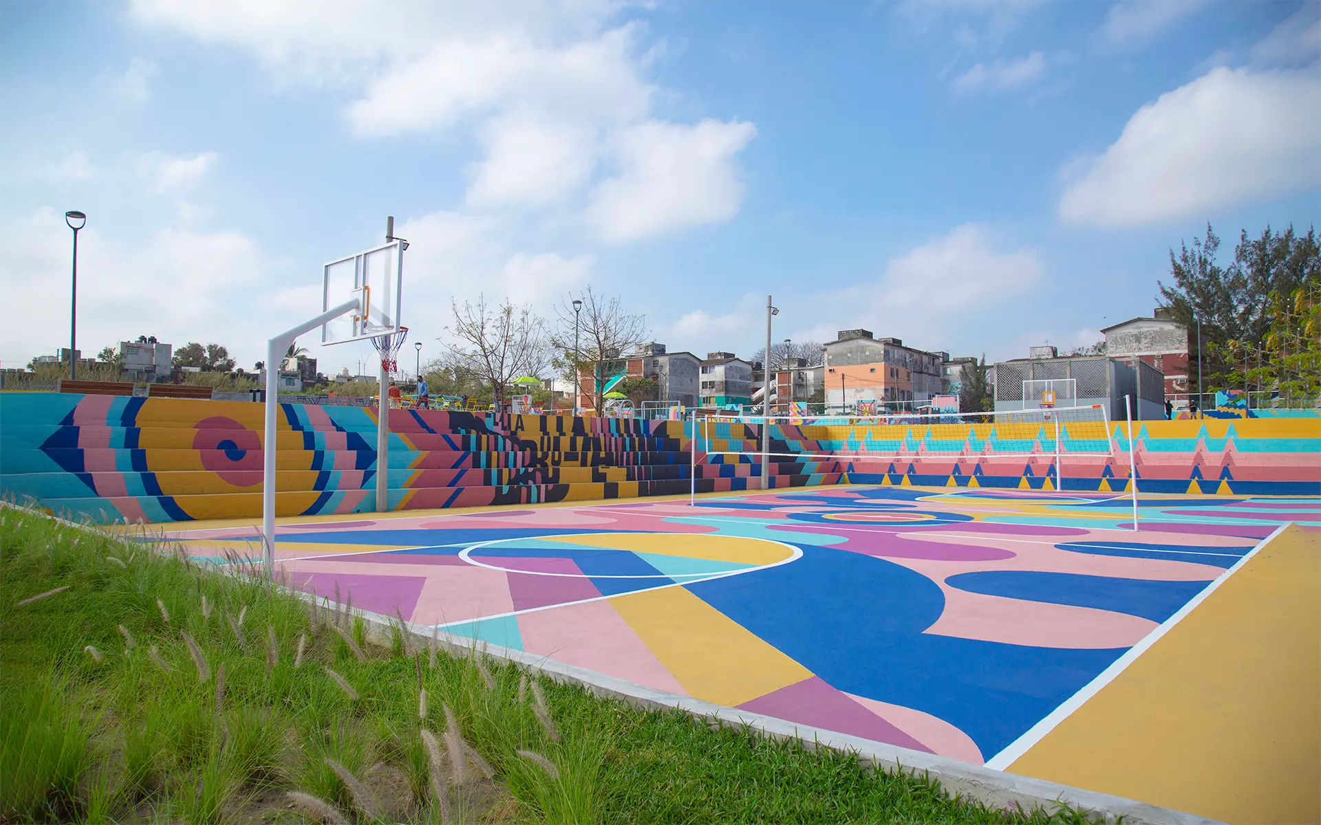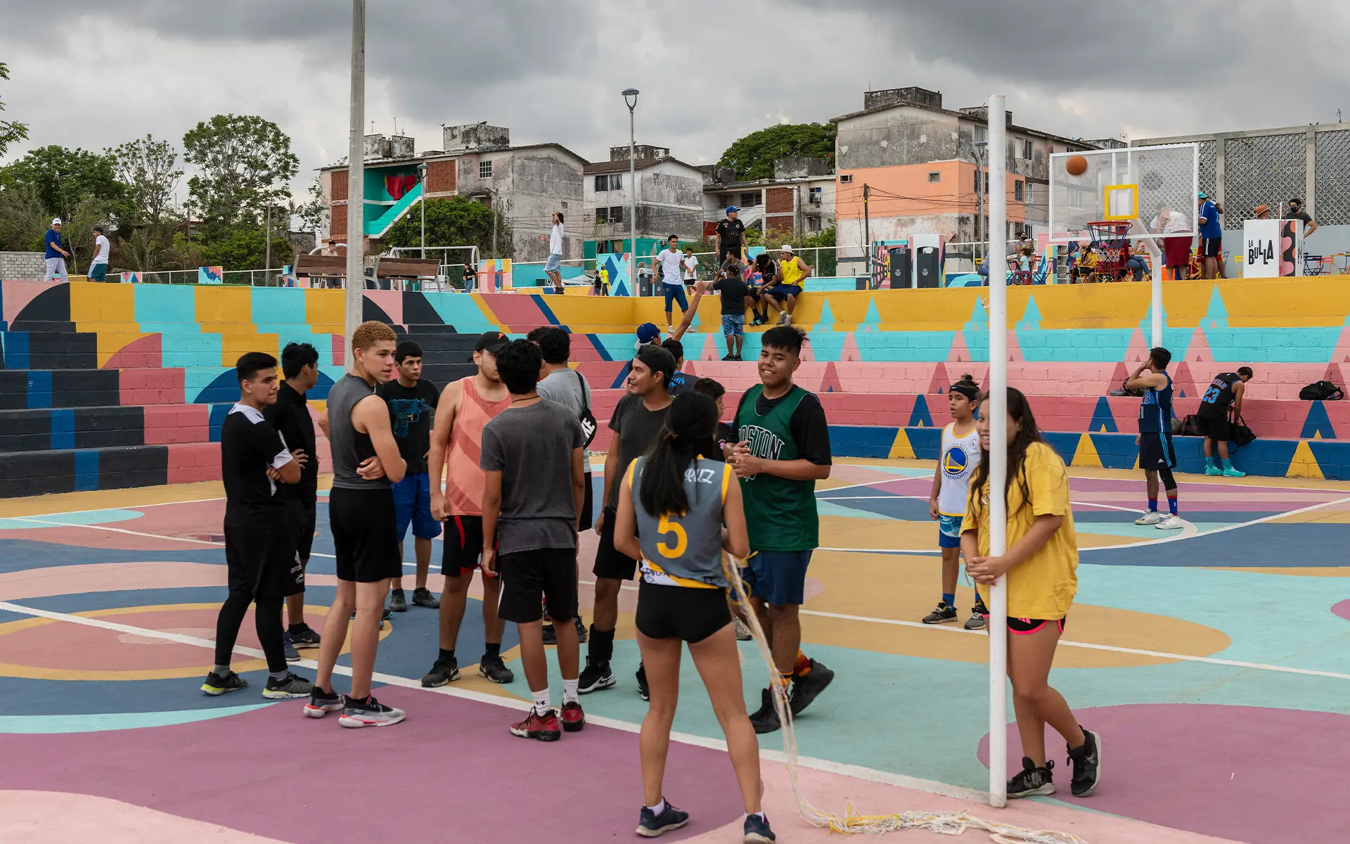 La intervención abarcó 6,000 m² e incluyó canchas renovadas, juegos infantiles, áreas verdes, mobiliario urbano, módulos para actividades culturales y un parque de 2,500 m². La identidad visual, creada a partir de los colores, ritmos y energía de los jarochos, convierte el espacio en un escenario de convivencia, deporte y cultura. “La Bulla” es hoy un punto de encuentro que refuerza la identidad local y transforma la percepción de la zona.
