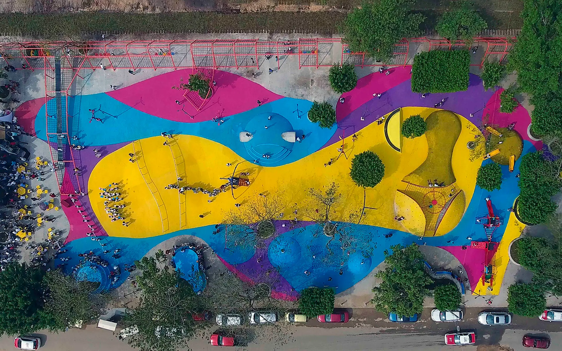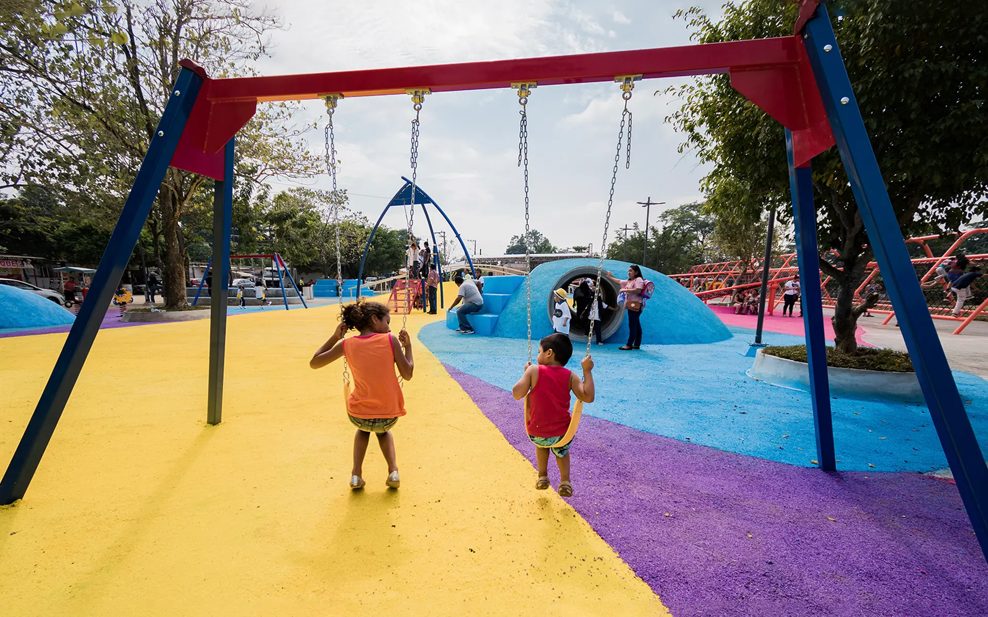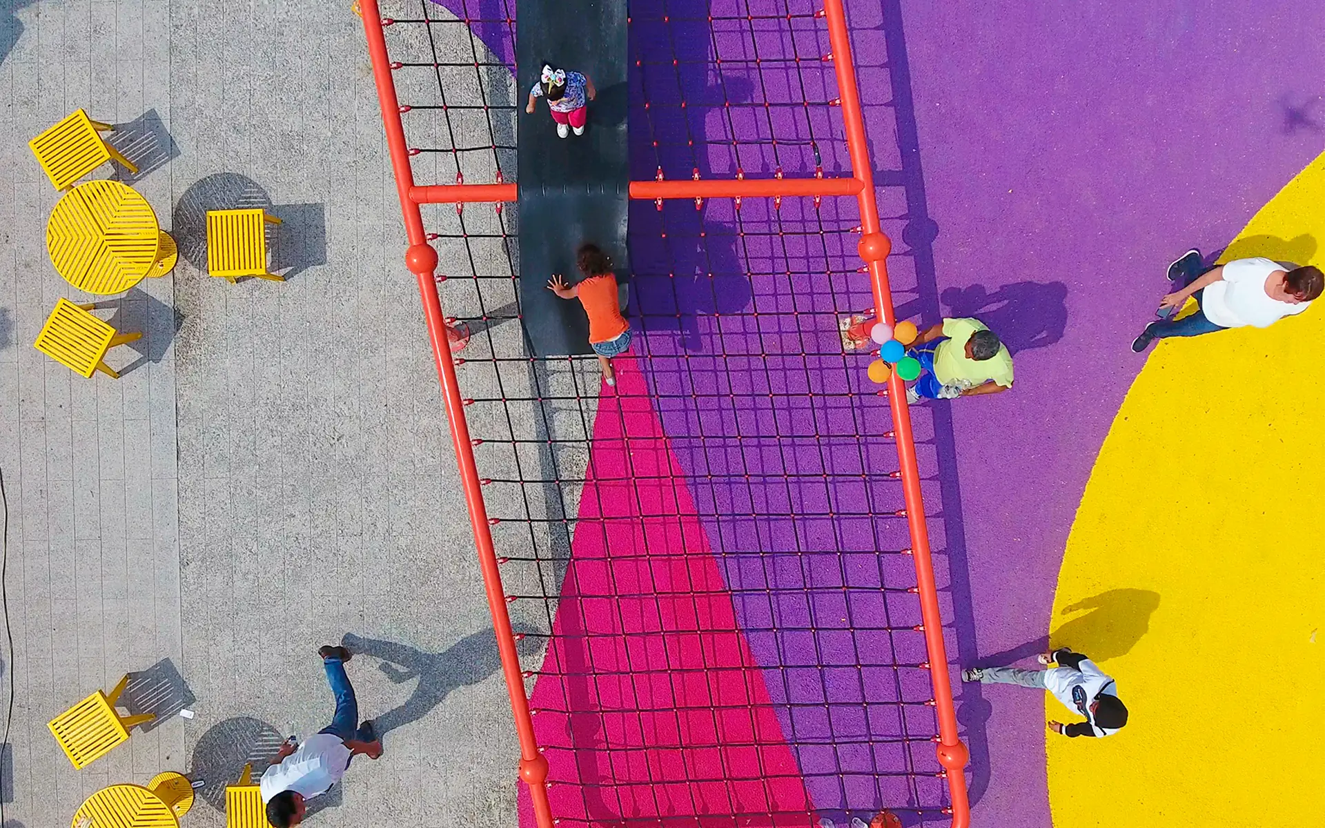 En colaboración con Ariel Rojo, se diseñaron juegos únicos: lomas cubiertas de caucho con resbaladillas, redes y piedras de escalar que estimulan la imaginación. Como pieza central, un gran juego-red de 90 metros, creado a la medida del lugar, integra columpios, puentes y obstáculos en una experiencia lúdica sin precedentes. Un parque que demuestra cómo el diseño puede transformar la vida pública desde la infancia.