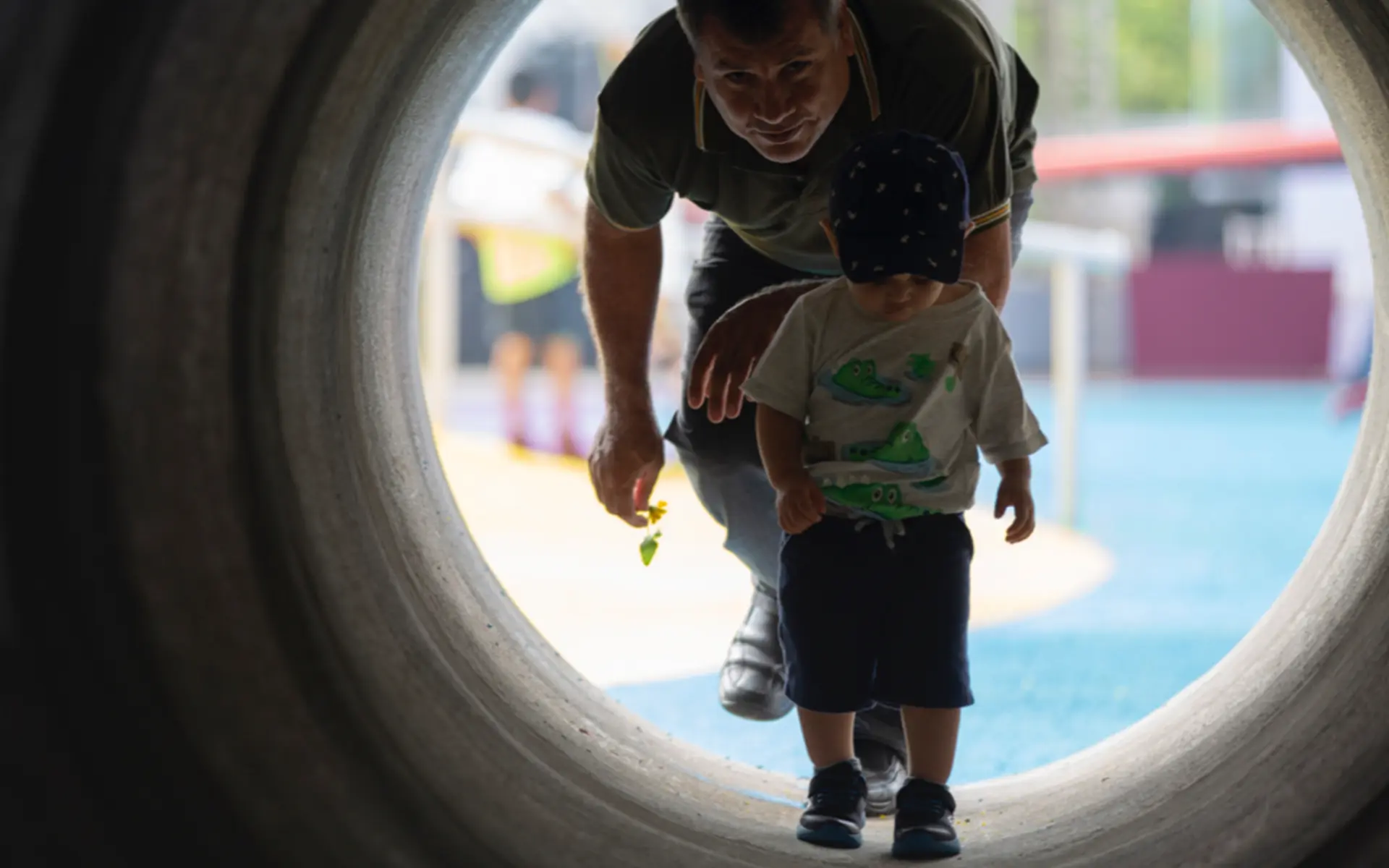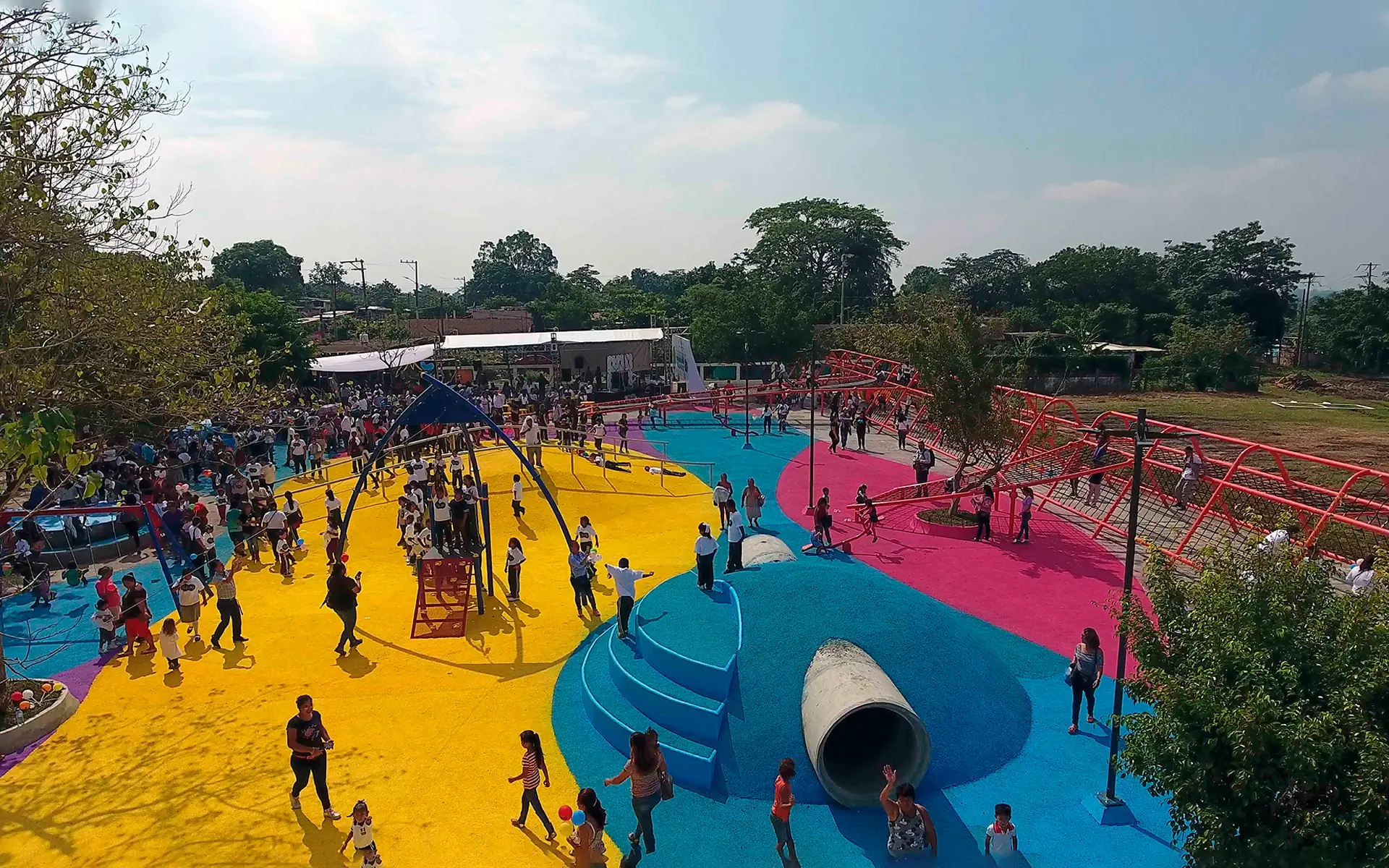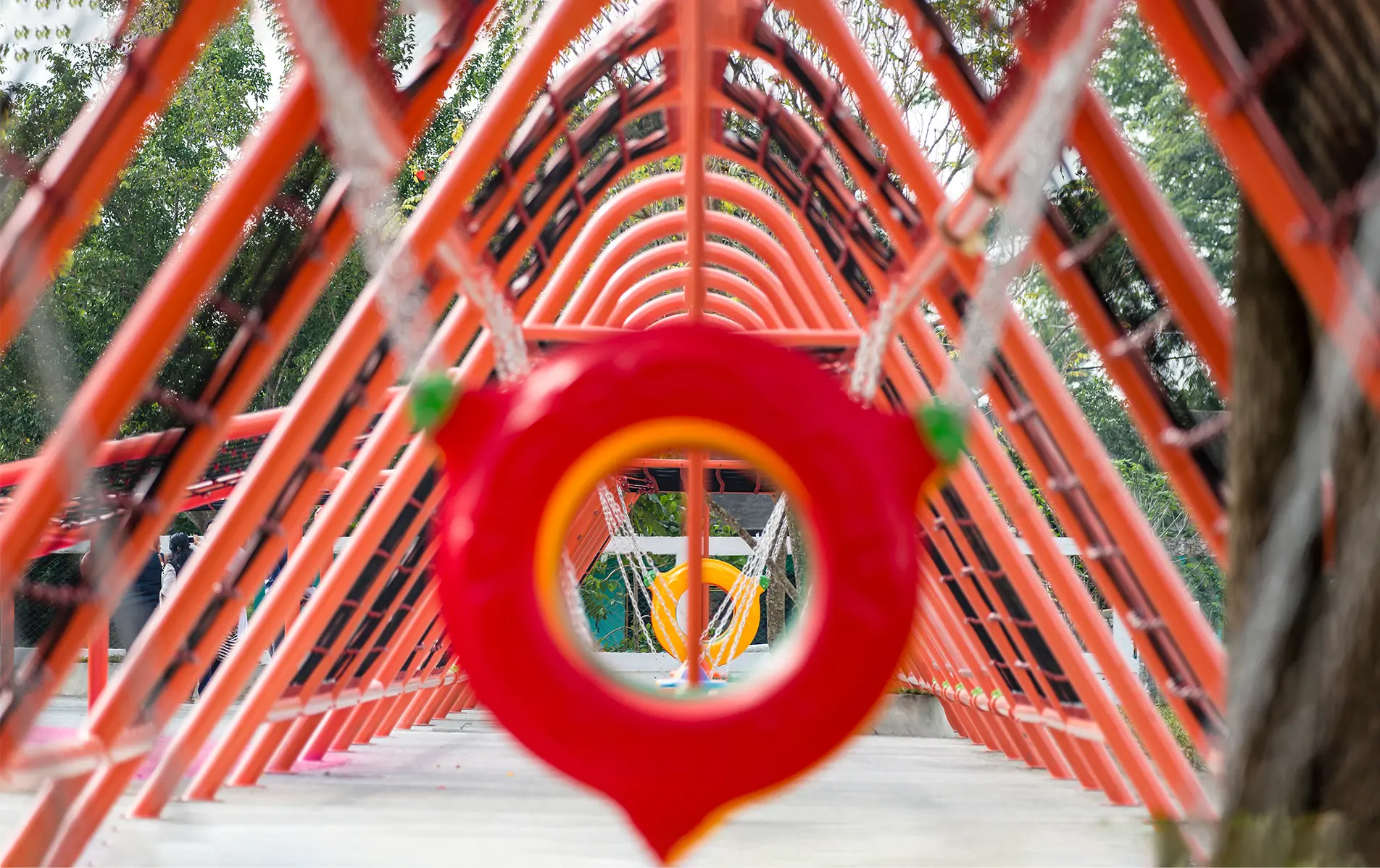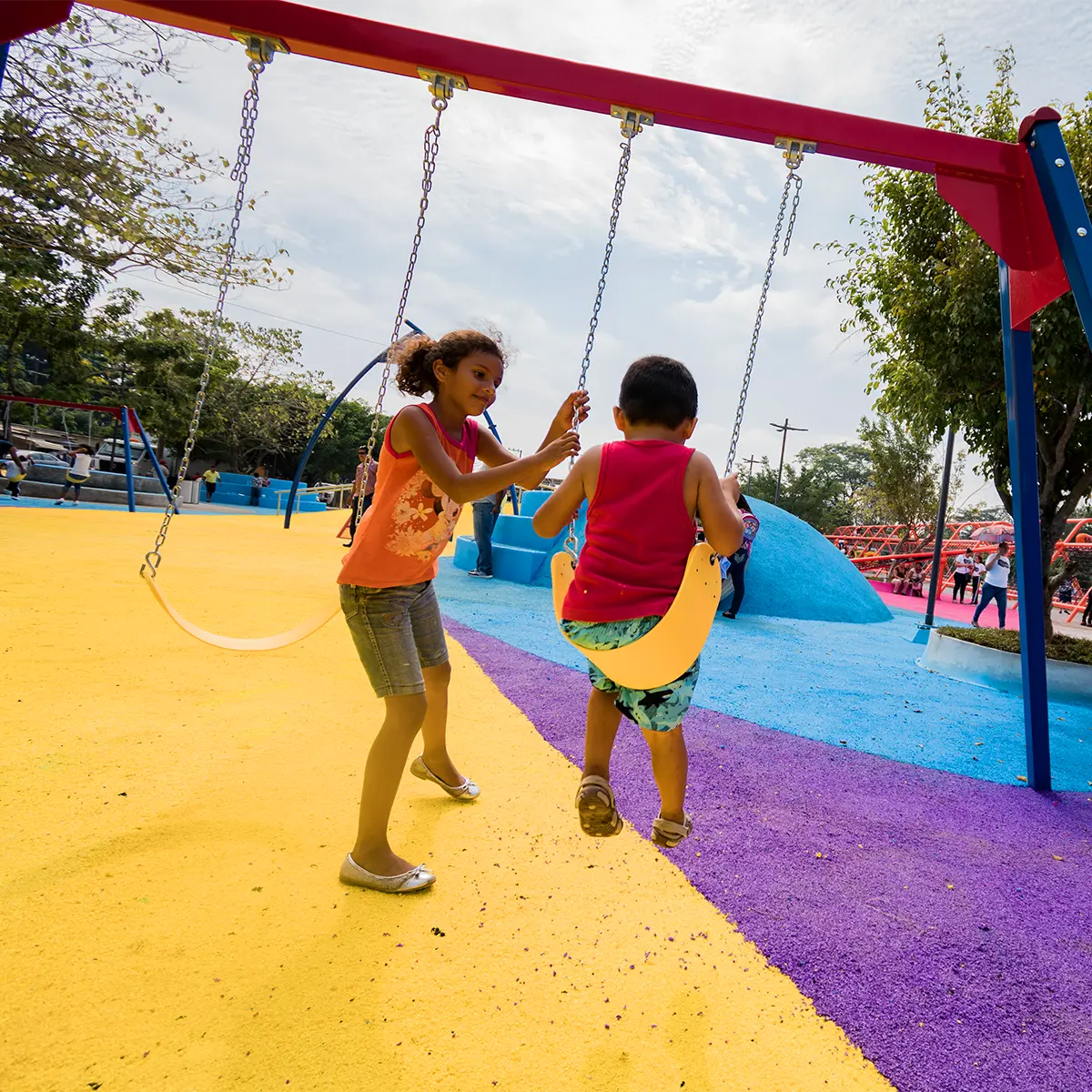En colaboración con Ariel Rojo, se diseñaron juegos únicos: lomas cubiertas de caucho con resbaladillas, redes y piedras de escalar que estimulan la imaginación. Como pieza central, un gran juego-red de 90 metros, creado a la medida del lugar, integra columpios, puentes y obstáculos en una experiencia lúdica sin precedentes. Un parque que demuestra cómo el diseño puede transformar la vida pública desde la infancia.
